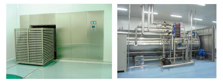 Filling with circulation water (Pure water) to a preset level. Heating up with circulation water. During heating up a preset differential ballast pressure above the relevant saturated steam pressure is maintained in the chamber by compressed air that prevents damage of the product containers. Sterilization for a preset time under a preset differential ballast pressure with a guaranteed temperature distribution inside the product of ±1℃.Cooling with primary circulation water, which is pumped through the cooling water cooled external heat exchanger and sprayed over the load. During the cooling process a preset differential ballast pressure above the relevant saturated steam pressure or a fixed ballast pressure is maintained in the chamber.
